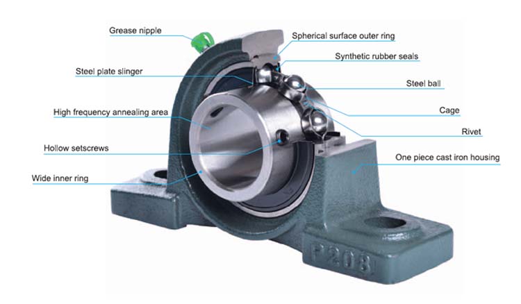 Originalus guolys UCPA207 2 colių pagalvių bloko guolio vienetas paprastai susideda iš dvipusio sandariklio, kuriame yra aliejaus įrodytas sintetinis guminis sandariklis ir plyšys iš abiejų guolio pusių.